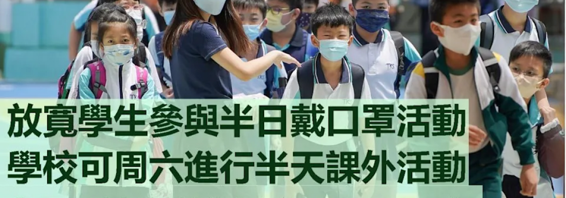 因應政府早前公布,今日會如期實施第二階段放寬社交距離措施,教育局會放寬學生參與半日而無須除下口罩的活動,如畢業禮、家長日、開放日及校園參觀等的條件。然而,出席活動的學生仍須符合相關場地對進場人士的防疫要求。此外,中小學及幼稚園在周六亦可安排學生進行半天無須除下口罩的非學術性的課外活動(如音樂或體育活動、校隊訓練)。教育局相信上述措施有助學生更好適應正常的校園生活,同時亦讓學校能為學生安排更加多元化的活動,加強他們的身心發展。